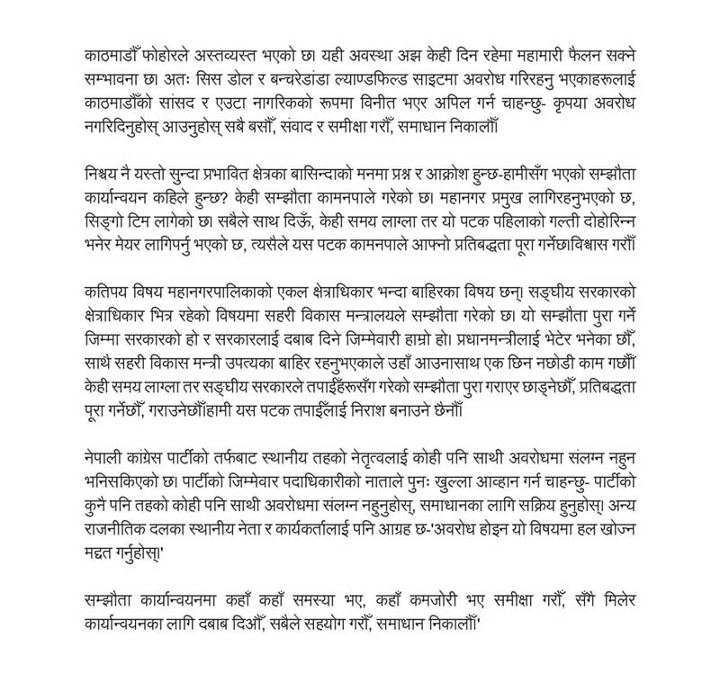 उनले भनेका छन्- ‘काठमाडौँ फोहोरले अस्तव्यस्त भएको छ । अझ केही दिन यस्तैरहे महामारी फैलन सक्ने सम्भावना छ । अतःसिसडोल र बन्चरेडांडा ल्याण्डफिल्ड साइटमा अवरोध गरिरहनु भएकाहरूलाई काठमाडौँको सांसद र एउटा नागरिकको रूपमा विनीत भएर अपील गर्न चाहन्छु, कृपया अवरोध नगरिदिनुहोस् आउनुहोस् सँगै बसौँ,समाधान निकालौँ ।’
