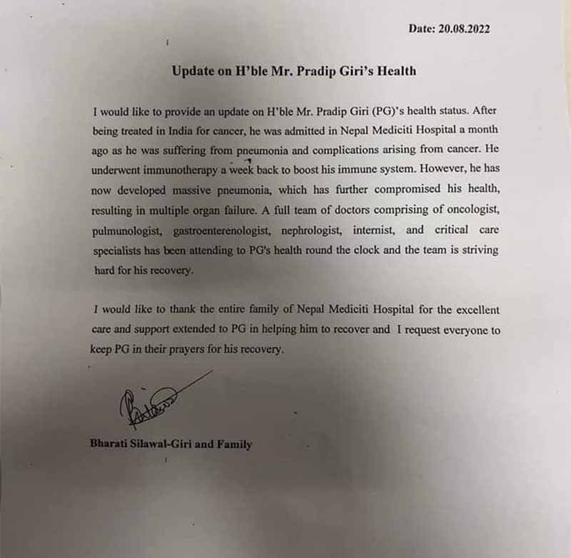 वक्तव्यमा गिरीको स्वास्थ्यको जटिलता र वर्तमान अवस्थामाथि प्रकाश पारिएको छ । एक महिनाअघि घाँटीको क्यान्सरको उपचार गरि नेपाल फर्किएका गिरीलाई निमोनिया देखिएको थियो । उनी एक महिनादेखि नेपाल मेडिसिटी अस्पतालमा उपचार गराइरहेका छन् । पछिल्लो समय उनको स्वास्थ्य थप जटिल बनिरहेको छ ।