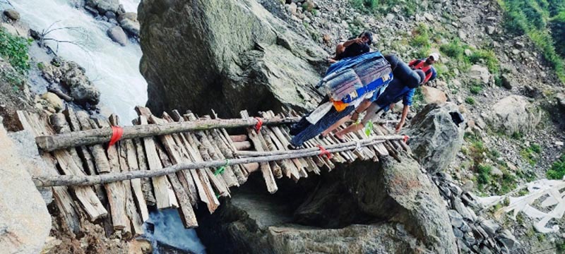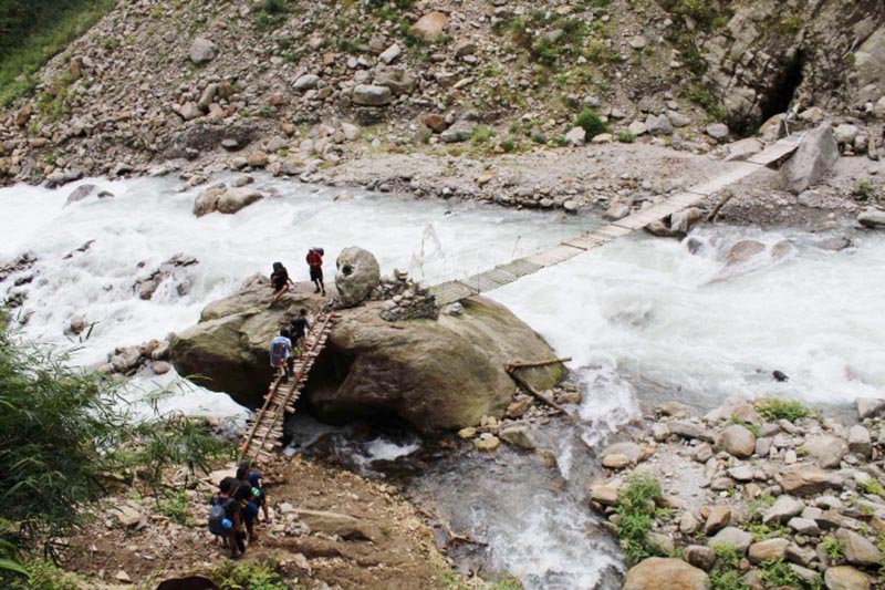 माथि टोपी खस्ने अक्करे भीर । तल सलल… बगिरहेको ब्रम्हायणी नदी । भित्तामा समातेर गन्तव्यमा पुग्नुपर्ने बाध्यता । भीरको बाटो हुँदै हुँदै गरिने यात्राका क्रममा तलतिर होस् वा माथितिर हेर्दा आङनै जिरिङ्ङ्गै हुनेगर्छ । सिन्धुपाल्चोकको निकै बिकट भनेर चिनिने जुगल गाउँपालिकाको तेम्बाथान, दिपुलगायतका गाउँमा जान यो अक्करे भीरविना सम्भव छैन ।